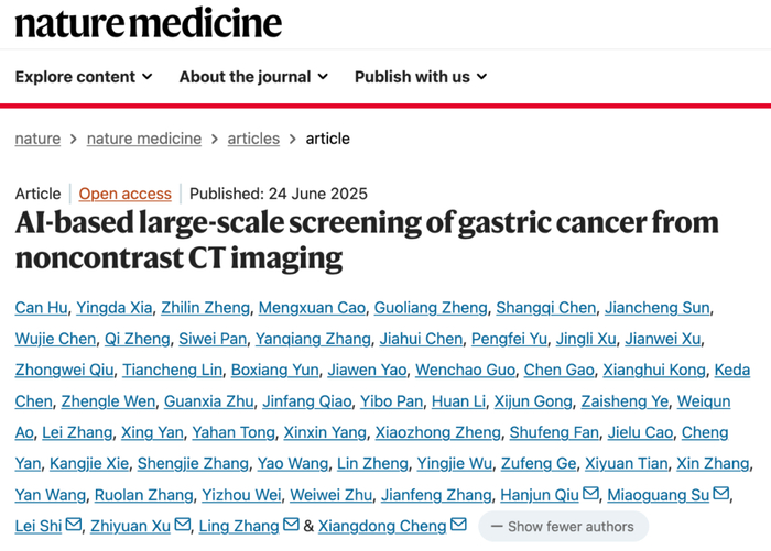 2025 年 6 月 24 日,阿里达摩院张灵及浙江省肿瘤医院程向东、徐志远、石磊、温州市平阳县人民医院苏缪广、宁波市奉化区人民医院裘邯军等人在国际顶尖医学期刊 Nature Medicine 上发表了题为:AI-based large-scale screening of gastric cancer from noncontrast CT imaging 的研究论文。