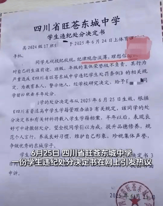 6月25日,四川省旺苍东城中学一份高中学生违纪处分决定书在网上引发热议。