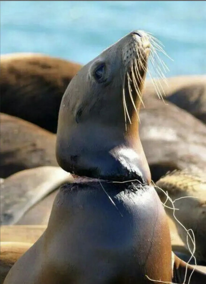 上面这只海狮被一个绳索套住了脖子,让他皮开肉绽!