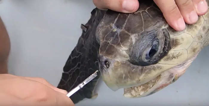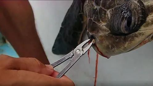 这只海龟被人发现时,它的鼻子上插着塑料吸管,研究人员帮忙用钳子给它夹了出来。