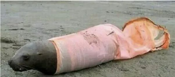 还是一只海狮(上图),它被塑料袋给包裹了,自己根本无法挣脱。