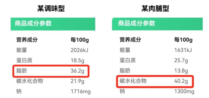 以调味肉制品为例,其平均热量高达449kcal/100g,是风干型牛肉干的两倍多!有的品牌脂肪含量飙升至惊人的 37.6g/100g。肉脯型的含糖量超高,有的品牌碳水化合物含量高达40.2g/100g,其中大部分是添加糖。