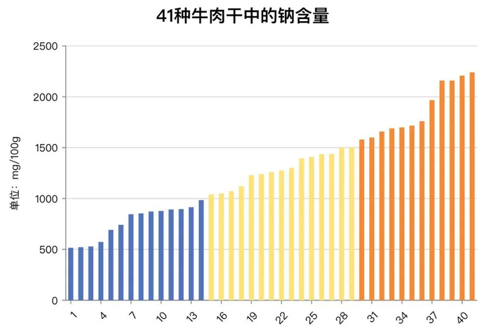 根据市面上牛肉干的含盐量梳理,钠含量普遍分布在 500~2000mg/100g之间。这意味着,仅仅食用100克牛肉干,就可能摄入高达1.25~5克的盐(1克钠约等于2.5克盐)。