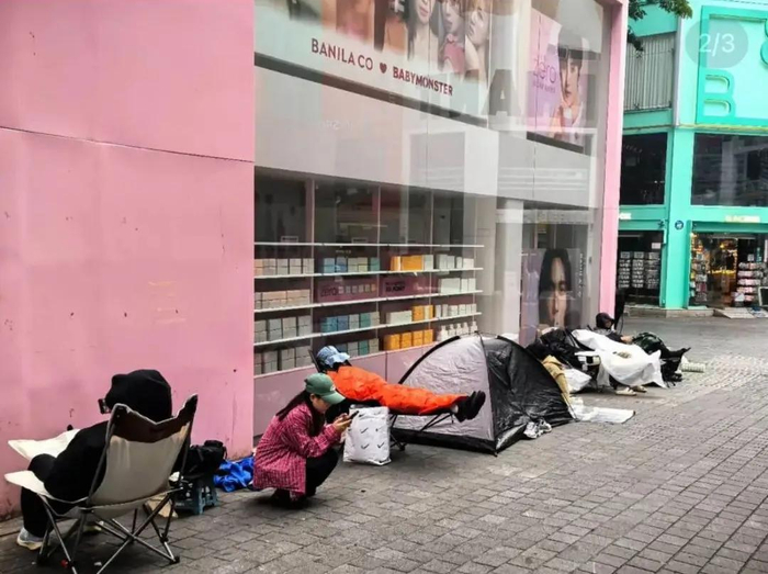 韩国首尔明洞的宝子拿着毛毯、小马扎在门口蹲守一夜,洛杉矶的家人们还带了帐篷。