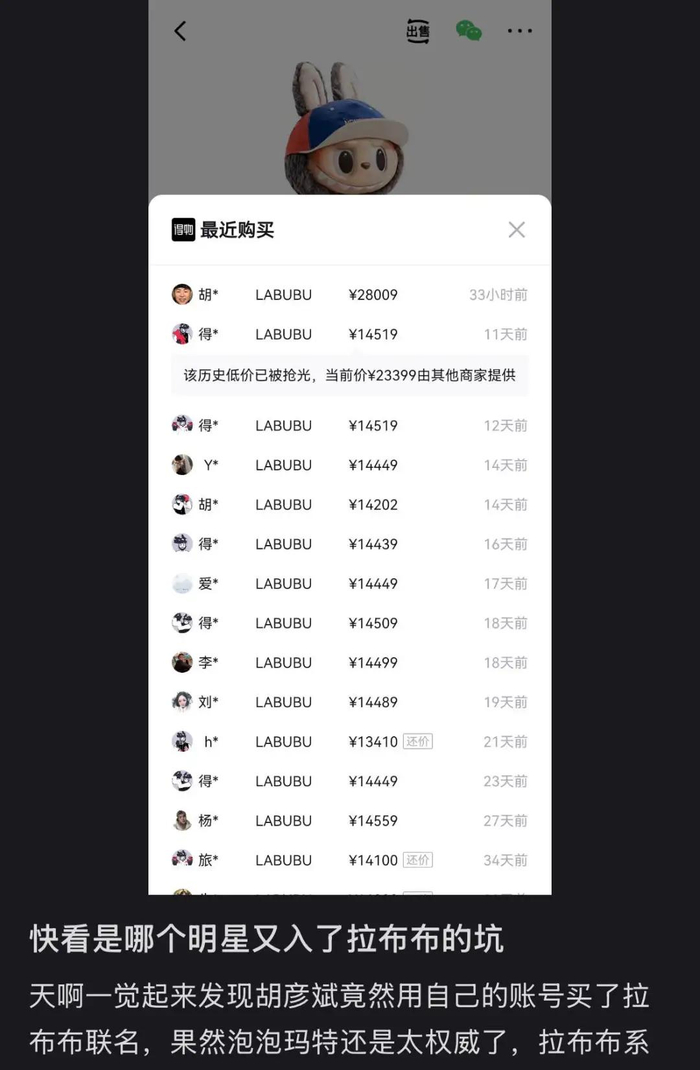 拉布布与Vans联名款,发售价为599元一度被炒到近1.5万,最近歌手胡彦斌在某物购入该款花了2.8万。