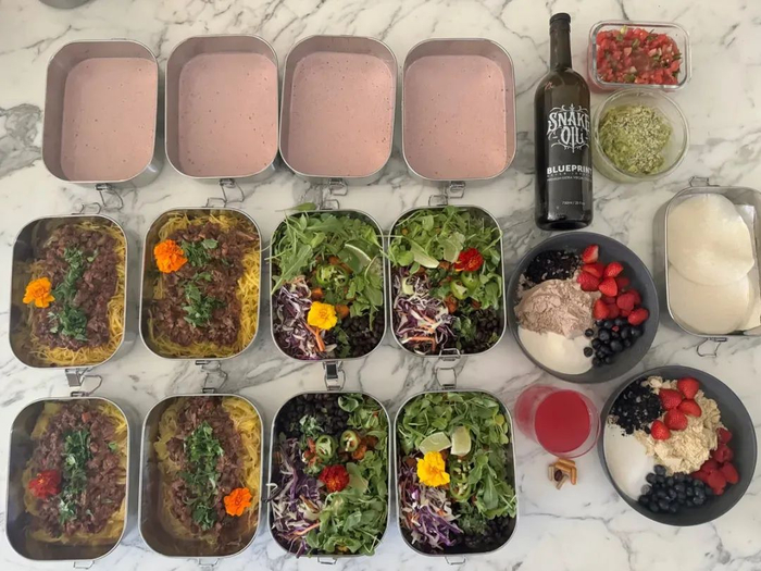 为了尽可能地降低睡前静息心率,他会在每天中午11点半结束一切进食,每天摄入热量不超过2000千卡。在逆龄的蓝图计划里,他每天喝那混合了小球藻粉、亚精胺、氨基复合物等粉末的“绿巨人”饮料,吃有大量蔬菜、豆类、植物蛋白等组成的素食碗,并生吞几勺橄榄油。