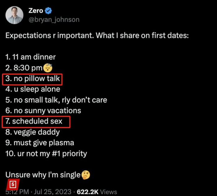 在布莱恩的“器官年龄体系”中,夜间勃起时长是衡量男性健康的重要指标,他每晚都要用到一种类似戒指的环状传感器设备,去监测阴茎状态。不过,这位47岁的抗衰达人从不在夜间性爱,因为多巴胺会影响睡眠。因此,成为他的另一半,做爱需要提前预约,要写进这位同时兼任四家公司CEO的富豪的日程(Scheduled sex)里;而恋人睡前枕边的悄悄话(pillow talk),也不被允许。
