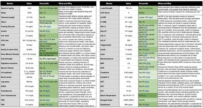 这一套长寿体系,击中了本就对身心健康极感兴趣的布莱恩的心。在科技领域创业的经验,让这位富豪信赖客观的数据和排名,而不是不同专家们众说纷纭的主观意见。这套抗衰计划的结果,可以通过抽血化验、核磁共振和超声检查等测量,有了数据就可以去对照、去排名,去建构一场比赛。