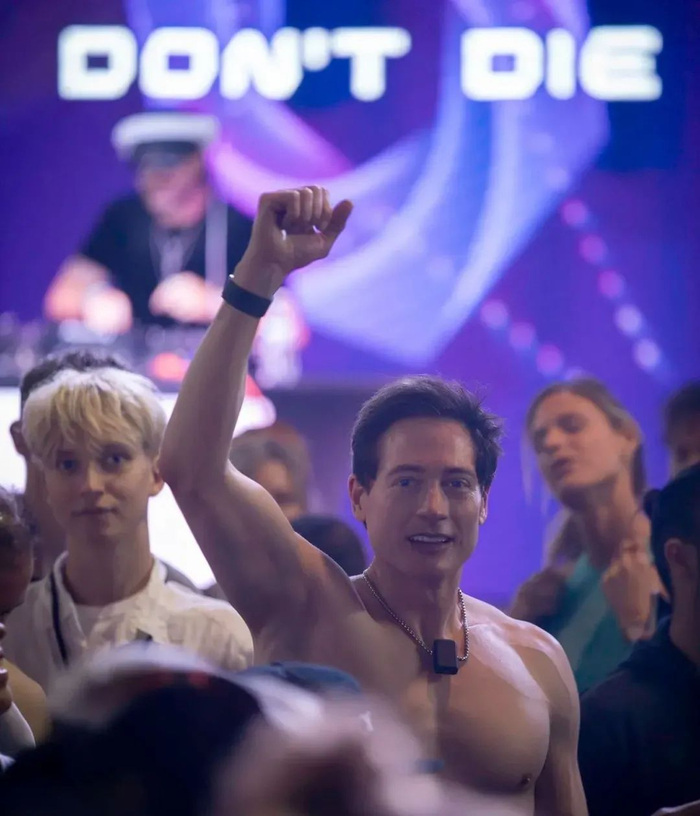 早上9点30,新加坡的清晨阳光洒进高楼大厦,而布莱恩的Don’t Die线下集会却如同一场午夜狂欢。黑暗中,震颤的电子乐鼓点撕裂着空气,镭射灯交替闪烁着红蓝绿光束,人群在会场上畅快地舞蹈、摇曳着身躯。激动处,男人们甩掉上衣,与台上赤裸着晒出肌肉的布莱恩应和。