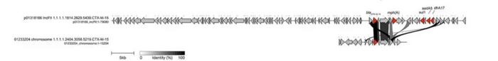 在对英国2016–2023年间MSM人群中传播的Shigella sonnei进行的研究中,发现t10.1814簇中携带blaCTX-M-15的质粒均为IncFII型,大小为77.6–149.0 kb。含blaCTX-M-27的前体菌株质粒更大,但两者基因组成高度相似,仅blaCTX-M整合子区域存在差异。与t10.377的IncFII质粒相比,结构基本一致,仅在可变区有轻微差异。另有一株t10.2404簇菌株将blaCTX-M-15整合入染色体,质粒丢失,整合位点为tRNA-Phe附近的噬菌体残留序列。