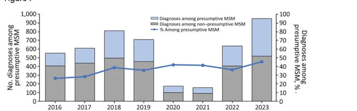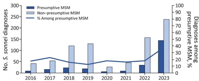 在此期间,推定为男男性行为者(MSM)人群中的病例占比也显著上升。2016年,这一群体约占26%的病例,而到了2023年上升到了46%。与2016–2022年平均水平相比,2023年推定MSM群体中的病例增长了82%,远高于非MSM群体的增长(仅为31%)。这表明志贺氏菌的传播已在该人群中重新活跃。
