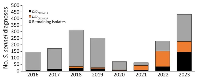 对收集到的Shigella sonnei分离株进行全基因组测序后发现,携带blaCTX-M-15基因的菌株数量显著增加。在2016–2022年间,这类菌株仅占全部分离株的10%,而到了2023年,这一比例上升到33%。与此相反的是,携带blaCTX-M-15基因的菌株比例在2023年下降了。