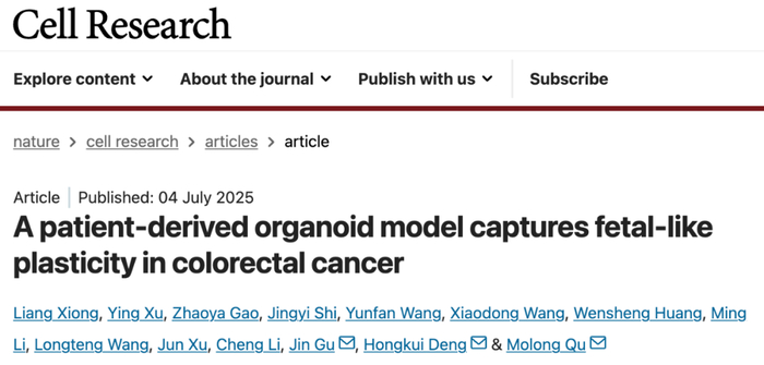 2025 年 7 月 4 日,北京大学邓宏魁教授、屈默龙副研究员、北京大学首钢医院/北京大学肿瘤医院顾晋教授团队(熊亮、徐莹、高兆亚为共同第一作者)在 Cell Research 期刊发表了题为:A patient-derived organoid model captures fetal-like plasticity in colorectal cancer的研究论文。