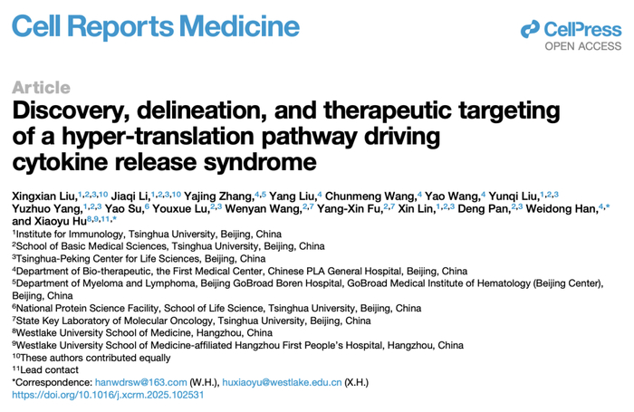 2025 年 12 月 31 日,西湖大学医学院胡小玉团队与解放军总医院韩为东团队合作(清华大学刘倖衔博士、博士生李佳琦为论文第一作者),在 Cell 子刊 Cell Reports Medicine 上发表了题为:Discovery, delineation and therapeutic targeting of a hyper-translation pathway driving cytokine release syndrome 的研究论文。