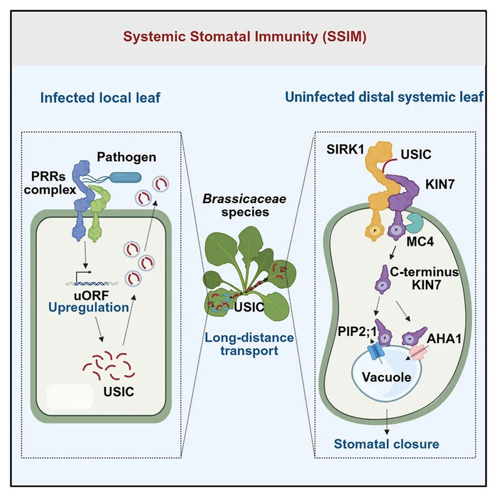 高等生物将感知组织接收到的外部刺激传递至全身,从而实现全身性反应。在植物中,保卫细胞感知病原体并关闭气孔以阻止其进入。该研究观察到,本地叶片在感染病原体后会将危险状态传递给未受感染的远端系统叶片,并触发其气孔关闭,这种全局性防御机制被研究团队命名为——系统性气孔免疫(SSIM)。研究团队进一步解析了具体机制——上游开放阅读框(uORF)编码的系统性气孔免疫传导肽(USIC),作为一种长距离移动肽诱导 SSIM。在本地叶片中,USIC 在病原体/模式信号作用下增加,并分泌到质外体(apoplast)进行长距离运输。在系统叶片中,USIC 由细胞表面的 SIRK1-KIN7 受体复合物感知,并诱导由 MC4 介导的 KIN7 裂解。KIN7 与AHA1 质子泵/ PIP2;1 水通道蛋白相互作用,使液泡失水,调控气孔关闭。该研究揭示了一种系统性信号机制,即由 uORF 编码的移动信号及其受体途径激活系统性气孔免疫(SSIM)。