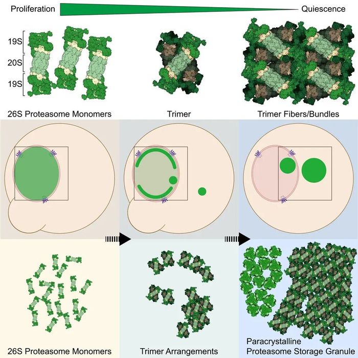 该研究通过原位冷冻电镜技术,结合对酵母蛋白酶体储存颗粒(PSG)形成过程的研究,揭示无膜细胞器形成过程及其对颗粒组分结构影响。在从增殖状态向静息状态转变的过程中,被捕获在非活性状态的双帽 26S 蛋白酶体会排列成约 7.5 MDa 的三聚体单元,这些单元分散在核质中,并聚集在核孔附近的核膜周围。9 埃分辨率的冷冻电镜结构显示,在不同能量限制条件下形成的细胞质 PSG 是由蛋白酶体三聚体堆叠形成的束状纤维准晶阵列。这种准晶排列方式维持了一个完全组装但处于非活性状态的 26S 蛋白酶体储备库,这些蛋白酶体在能量充足条件下会被释放。总体而言,该研究揭示了细胞内无膜细胞器原位组装的结构步骤,以及控制主要真核生物调控机器的五级结构形成过程。