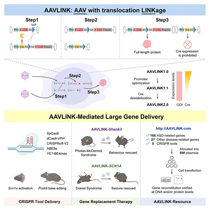 该研究设计了一种名为 AAVLINK(AAV with translocation LINKage)的新策略,利用 Cre/lox 介导的分子间 DNA 重组来克服递送载荷大小的限制,实现了卓越的基因分割灵活性、强大的基因重组效率,并显著减少了截短的蛋白质产物。AAVLINK 实现了孤独症致病基因 Shank3 或癫痫症致病基因 SCN1A 的完整表达,并分别挽救了小鼠模型的孤独症样行为和癫痫表型。该研究还生成了带有不稳定 Cre 的 AAVLINK2.0 以解决生物安全性问题。重要的是,研究团队利用 AAVLINK 构建了一个包含 193 个与遗传疾病相关的大型基因和 5 种经过验证的基因重组的 CRISPR 工具的载体库,从而建立了一种利用 AAV 递送大片段基因的可靠方法。