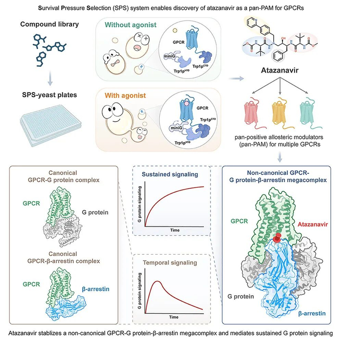 约有三分之一的临床药物通过 G 蛋白偶联受体(GPCR)介导其治疗作用,这凸显了其巨大的治疗相关性。调控 GPCR 活性的新方法有可能产生独特的药理学特征。传统上,GPCR 下游的 G 蛋白和 β-arrestin 信号通路被视为互斥的。研究团队利用自主研发的生存压力选择(survival pressure selection,SPS)方法(一种用于 GPCR 激动剂发现的高通量平台),发现了一种变构配体——阿扎那韦(atazanavir,原用于艾滋病治疗),它能稳定 GPCR-G 蛋白-β-arrestin 超复合物,从而在内化后介导持续的受体信号转导。值得注意的是,这种化合物阿扎那韦在包括 GPR119、β1AR 和 β2AR 在内的多个 Class A GPCR 中表现出泛受体激活作用,证明了这种调控机制的广泛适用性。这一发现揭示了一种独特的 GPCR 调控机制,为开发靶向 GPCR 的疗法开辟了新途径。