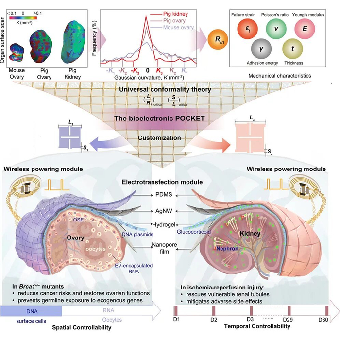 该研究开发了一种柔性可植入生物电子器件——POCKET(patch for organ-conformal, kirigami-structured electro-transfection),其通过参数定制实现了高贴合度,理论上可实现对目标器官的最大有效覆盖面积。四层结构的 POCKET 在组织-设备界面形成了独特的纳米孔-细胞并置配置,可诱导精确、均匀的电穿孔,同时加快有效载荷的细胞内运输。POCKET 的高递送效率和精确的空间可控性已在各种器官(例如卵巢、肾脏)中得到系统验证。POCKET 介导的治疗递送实现了器官对累积 DNA 损伤或缺血再灌注损伤的保护,恢复了器官功能。这项工作提出了一种具有可移植价值的可定制技术,适用于对治疗要求极高的目标器官进行安全、高效、精准的全器官药物递送或基因转染。