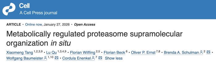 2026 年 1 月 27 日,马克斯·普朗克生物化学研究所 Tang Xiaomeng、Qu Lu 作为共同第一作者,在 Cell 期刊发表了题为:Metabolically regulated proteasome supramolecular organization in situ的研究论文。