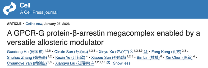 2026 年 1 月 27日,清华大学药学院刘翔宇团队(何国栋、孙沁心、许心宇为论文共同第一作者,许心宇为论文共同通讯作者)在国际顶尖学术期刊 Cell 上发表了题为:A GPCR-G protein-β-arrestin megacomplex enabled by a versatile allosteric modulator 的研究论文。
