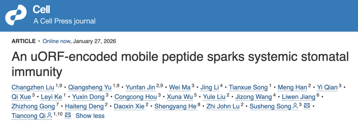 2026 年 1 月 27 日,清华大学齐天从副教授团队与首都师范大学宋素胜教授团队合作(刘长振、余强胜、金云帆为论文共同第一作者),在 Cell 期刊发表题为:An uORF-encoded mobile peptide sparks systemic stomatal immunity 的研究论文。