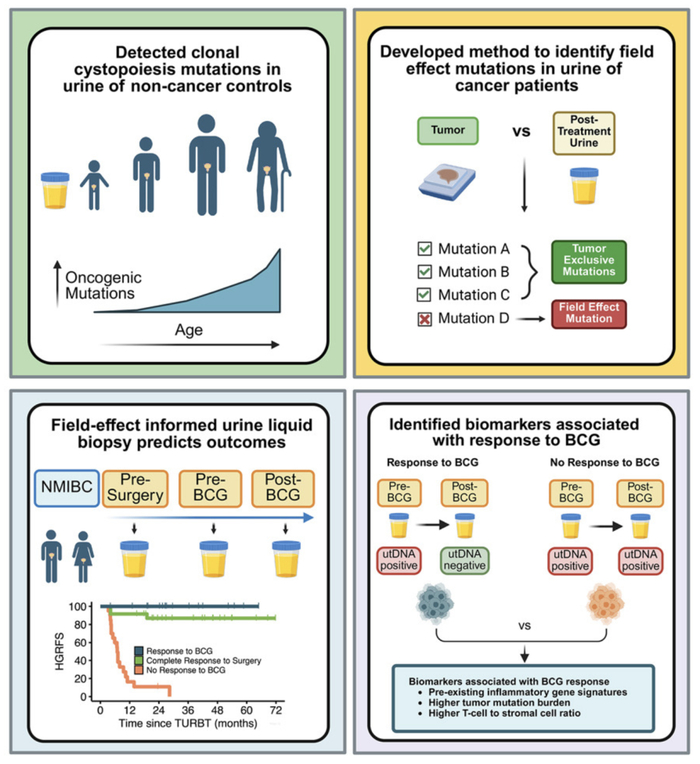 只有部分非肌层浸润性膀胱癌(NMIBC)患者受益于膀胱内卡介苗(BCG)治疗,且预测性生物标志物仍然缺乏。尽管尿液肿瘤 DNA(utDNA)分析前景广阔,但肿瘤邻近正常尿路上皮中的突变,即场效应(field effect),限制了其特异性。该研究显示,尿液中体细胞突变的流行率随年龄增长而增加。研究团队开发了一种改进的 utDNA 微小残留病变(MRD)方法,通过去除场效应突变来提高特异性。将这种场效应优化的 MRD 方法应用于 261 例接受手术和辅助 BCG 治疗的 NMIBC 患者样本,研究团队识别出三种分子响应类别,包括手术应答者、BCG 应答者和无应答者。对这两种疗法(手术、卡介苗)产生响应的分子预测指标有所不同,术前已存在的免疫激活和更高的突变负荷在卡介苗治疗的应答者中更为常见,而在手术应答者中则不然。这些发现突显了场效应优化的液体活检方法在指导个性化治疗和揭示多模式治疗个体组分的生物标志物方面的潜力。