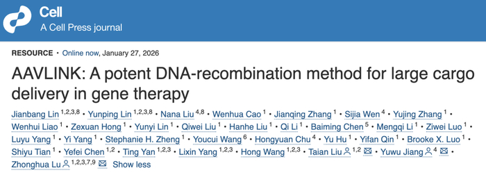 2026 年 1 月 27 日,中国科学院深圳先进技术研究院路中华研究员,北京大学第一医院儿童医学中心姜玉武教授,中国科学院深圳先进技术研究院刘太安副研究员作为共同通讯作者(林剑邦、林韵萍、刘娜娜为论文共同第一作者),在国际顶尖学术期刊 Cell 上发表了题为:AAVLINK: A Potent DNA-Recombination Method for Large Cargo Delivery in Gene Therapy 的论文。
