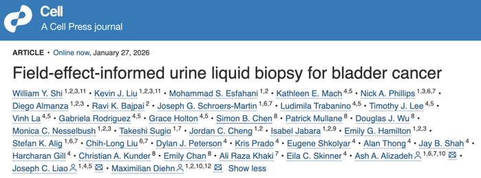 2026 年 1 月 27 日,斯坦福大学 Joseph C.Liao 作为共同通讯作者,William Y.Shi、Kevin J.Liu 作为共同第一作者,在 Cell 期刊发表了题为:Field-effect-informed urine liquid biopsy for bladder cancer的研究论文。