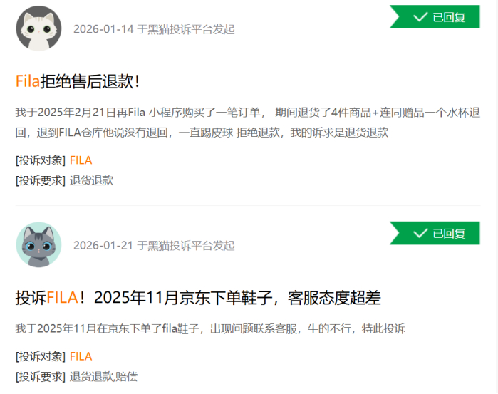 在黑猫投诉[下载黑猫投诉客户端]平台上,关于FILA的投诉有接近9000条,不少用户投诉FILA“客服态度差”“售后推诿”“产品质量差”等问题。