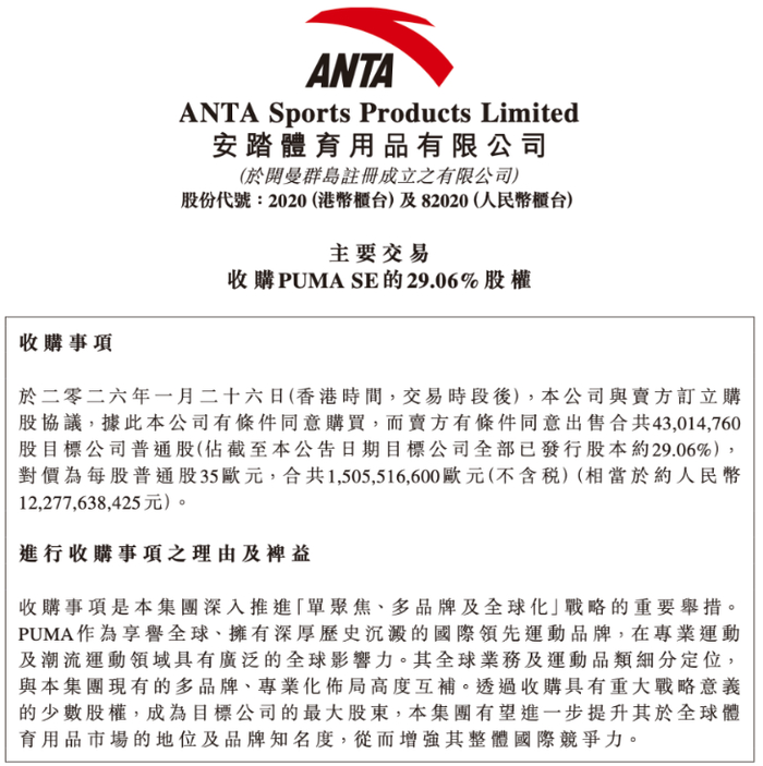 1月27日,安踏体育发布公告称,拟以15亿欧元(约123亿元人民币)收购彪马29.06%股权,成为这家德国运动品牌的最大单一股东。