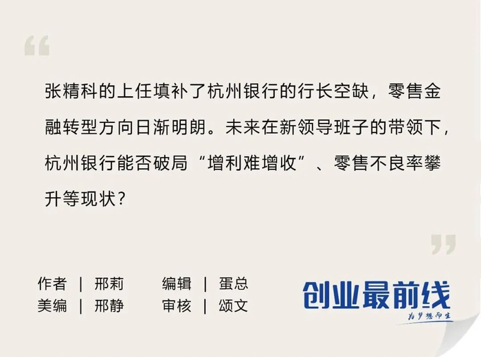 综合来看,当前张精科的上任填补了杭州银行的行长空缺,零售金融转型方向日渐明朗。未来在新领导班子的带领下,杭州银行能否破局“增利难增收”、零售不良率攀升等现状?对此,「创业最前线」将持续关注。