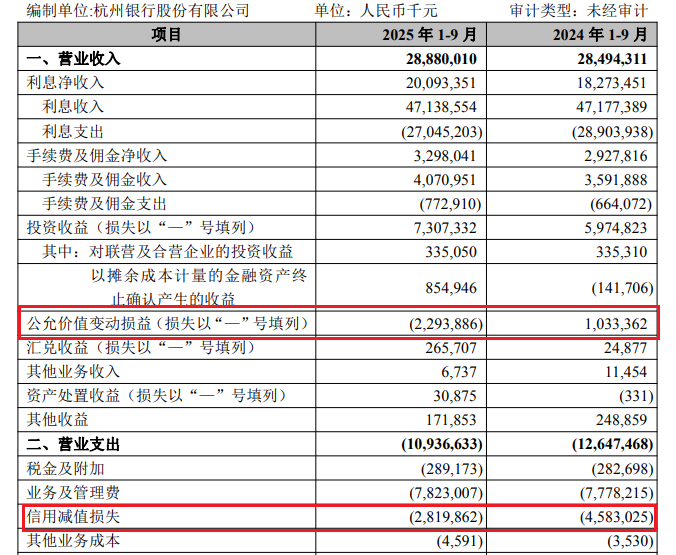 财报显示,杭州银行公允价值变动损益高达-22.94亿元的亏损,与2024年同期10.33亿元的正收益相比相差33.27亿元,严重拖累整体营收表现。