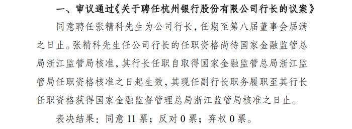 图 / 杭州银行公告张精科的行长任职资格尚待国家金融监督管理总局浙江监管局核准。此外,经杭州银行董事会审议通过,同意提名张精科为该银行第八届董事会董事候选人。
