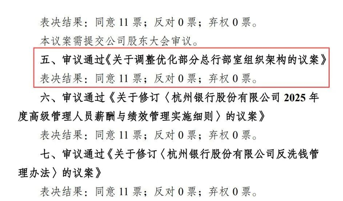 杭州银行第八届董事会第二十一次会议决议公告显示,董事会近期审议通过《关于调整优化部分总行部室组织架构的议案》。