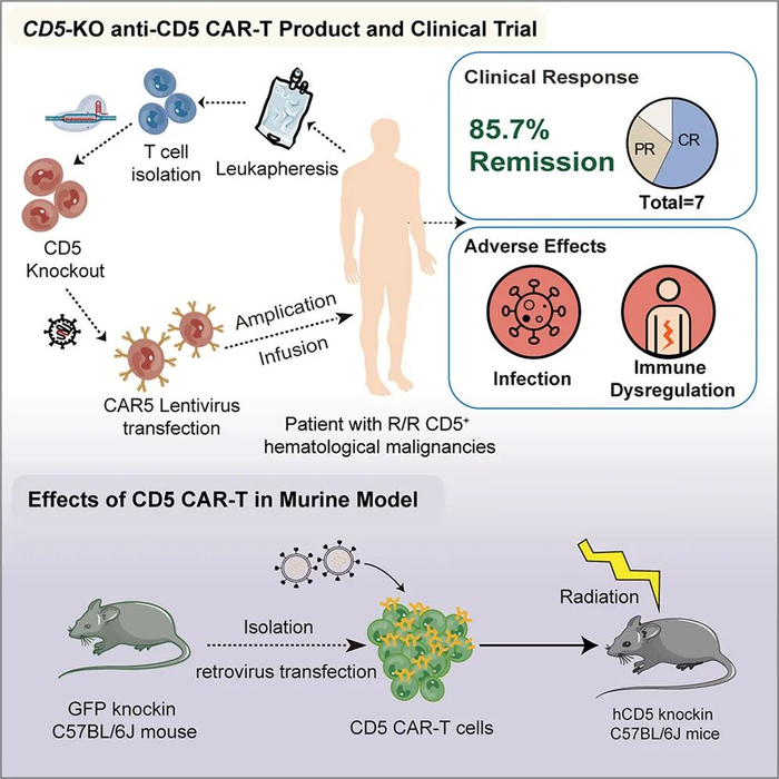 CD5 已成为 CAR-T 细胞疗法的一个颇具吸引力的靶点,尤其是用于 T 细胞恶性肿瘤的治疗。此前的一项 1 期临床试验(NCT03081910)评估了 CD5 靶向的 CAR-T 细胞在复发/难治性 T 细胞恶性肿瘤患者中的安全性和抗肿瘤效果,有部分患者达到了完全缓解或部分缓解,但这些反应往往不持久,这凸显了需要制定策略来增强 CD5靶向的 CAR-T 细胞在体内的持久性和长期疗效。