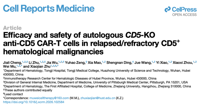 2026 年 2 月 2 日,华中科技大学同济医学院附属同济医院朱晓健团队等,在 Cell 子刊 Cell Reports Medicine 上发表了题为:Efficacy and safety of autologous CD5-KO anti-CD5 CAR-T cells in relapsed/refractory CD5+ hematological malignancies 的研究论文。