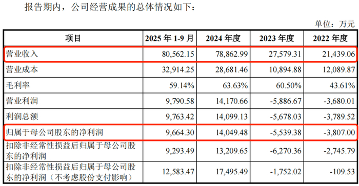 招股书显示,2022年至2025年1-9月(以下简称“报告期”),联讯仪器的营业收入分别为2.14亿元、2.76亿元、7.89亿元和8.06亿元;归母净利润分别为-3807万元、-5539.38万元、1.40亿元和9664.30万元。