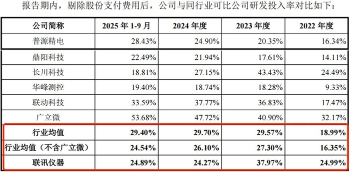 图 / 联讯仪器招股书报告期内,剔除股份支付费用后,同行业可比公司的研发费用率均值分别为18.99%、29.57%、29.70%和29.40%。在2024年和2025年前9月,联讯仪器的研发费用率低于行业均值。