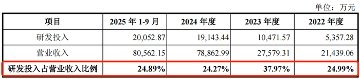 招股书显示,报告期内,公司的研发费用金额分别为5357.28万元、1.05亿元、1.91亿元和2.01亿元,占营业收入的比例分别为24.99%、37.97%、24.27%和24.89%。