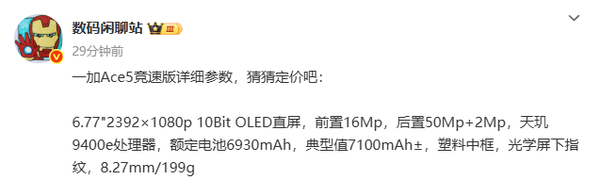 【CNMO科技消息】据一加手机官方消息,一加Ace 5至尊系列(包含一加Ace 5至尊版和一加Ace 5竞速版)将在5月27日下午14点30分开始发布。目前,数码闲聊站已经放出了一加Ace 5竞速版的详细配置。