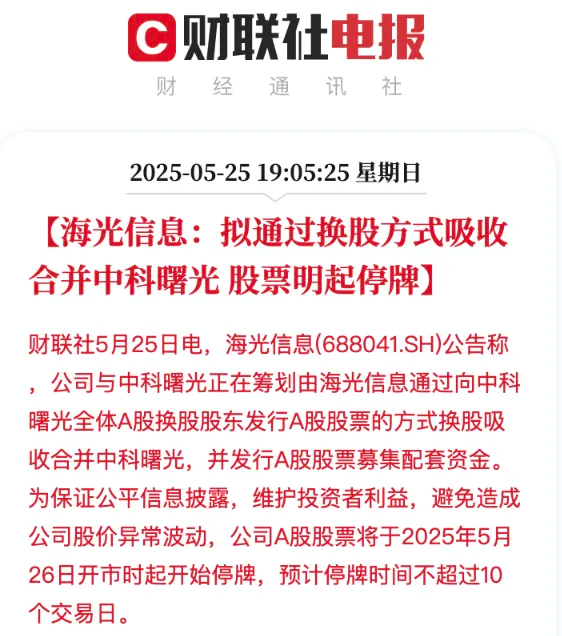 2025年5月25日,科创板芯片龙头海光信息与主板服务器巨头中科曙光宣布筹划换股吸收合并,交易金额预计超2000亿元,成为新《上市公司重大资产重组管理办法》实施后的首单A股合并案例。此次合并旨在整合双方技术、市场与产业链资源,打造国产算力“航母级”企业,推动国产替代与算力产业升级。