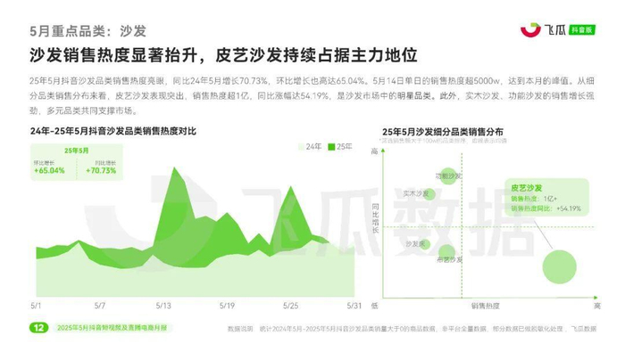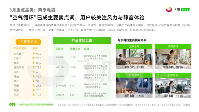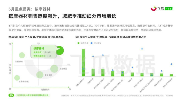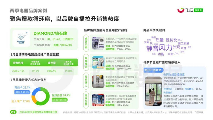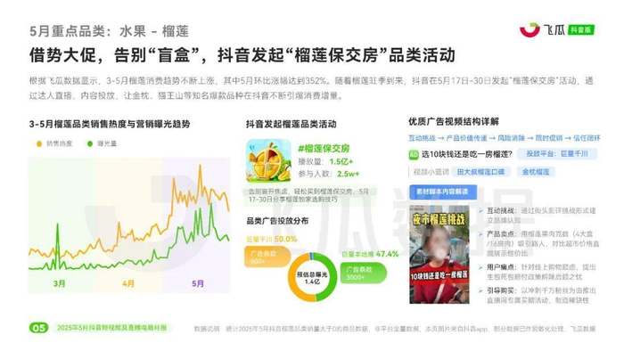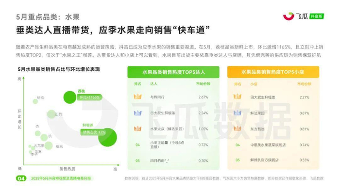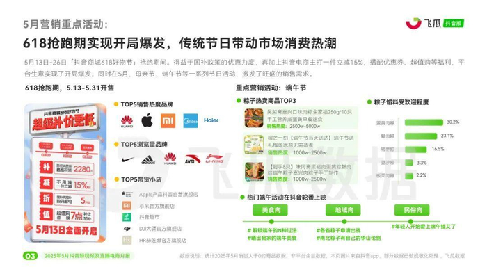 5月营销重点活动为“抖音商城618好物节”抢跑期,借助国补政策和平台优惠,实现开局爆发。同时,母亲节、端午节等节日带动了相关商品销售,如粽子、榴莲、荔枝等品类热度攀升。水果品类中,荔枝销售环比激增1165%,榴莲销售热度居首。电器品类在国补拉动下表现亮眼,两季电器如风扇等环比增幅达80.3%。按摩器材、沙发、驱虫用品等品类也呈现不同程度的增长,各品类通过达人直播、溯源直播、场景化营销等方式推动销售。