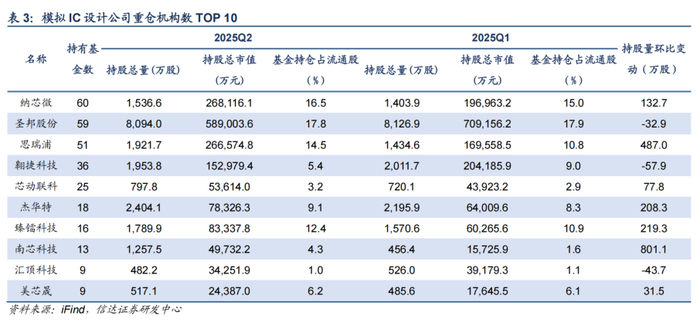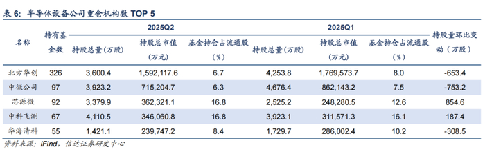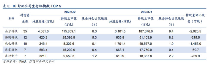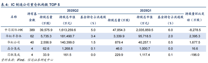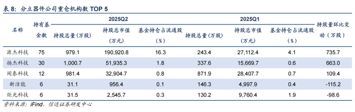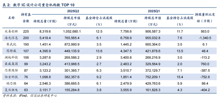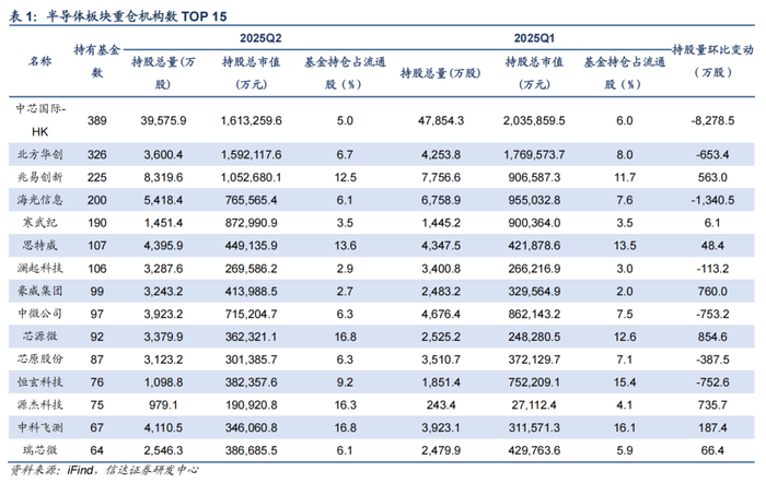 2025Q2,半导体板块机构持仓市值占比为9.94%,环比上季下降1.06pct。从基本面情况来看,二季度半导体下游景气度逐步回暖,产业链订单逐步恢复至正常水平;技术发展上看,国产AI芯片不断突破,同时ASIC需求弹性显现;外部环境看,中美关系缓和减轻了关税带来的负面影响,但潜在技术趋严的风险仍然凸显自主可控的重要性。从机构仓位配置的角度来看,华虹半导体、兆易创新、豪威集团、芯源微等获得机构加仓较多。