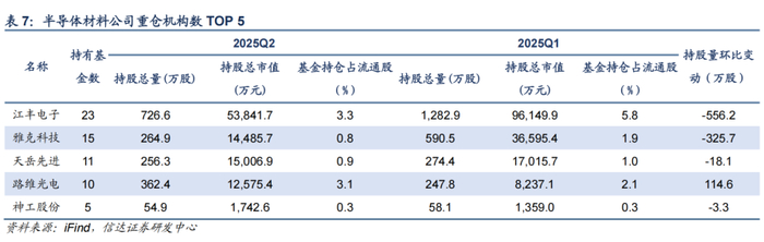 2025Q2,电子化学品板块机构持仓市值占比为0.49%,环比持平。2025年以来,伴随科技自主可控逻辑的演绎,上游电子化学品的国产替代不断受到重视,关键领域的突破刻不容缓。2025Q2,安集科技、鼎龙股份、莱特光电等获得机构加仓较多。