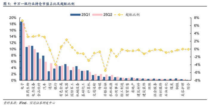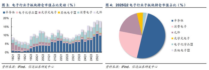 以申万行业分类(2021)为依据,我们选取了普通股票型基金、偏股混合型基金、平衡混合型基金及灵活配置型基金作为样本分析2025年第二季度末电子板块的重仓持股情况。2025Q2,A股电子行业配置比例为18.3%,依旧保持全市场第一位置,配置比例环比25Q1末下降0.4pct,超配比例达7.0%。