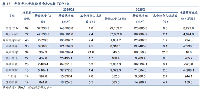 2025Q2,光学光电子板块机构持仓市值占比为0.74%,环比下降0.08pct。从机构仓位配置的角度来看,京东方A、TCL科技、舜宇光学科技等上市公司获得机构加仓较多。2025年一季度在国补政策刺激下拉动下游需求增长,面板价格普遍上涨。二季度市场热度未能持续,且前期备货较多导致下游需求较为疲软,价格从坚挺转向松动。我们认为,下半年随着消费电子新品发布,市场旺季到来,供需结构改善有望促成面板价格反转。