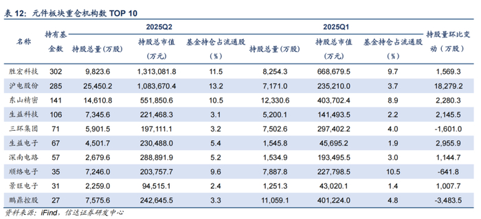 元件板块:全球AI基建加速进行,PCB业绩或持续高增。2025Q2,元件板块机构持仓市值占比为3.73%,环比提升1.44pct。受益于全球AI基础设施建设放量,胜宏科技、沪电股份、生益电子、东山精密、生益科技等获得机构加仓较多。我们认为从海外CSP资本开支计划来看,AI需求仍然具备较强确定性,云厂商和主权AI在基础设施的投资拉动算力产业链订单增长,产业链优质公司业绩逐步高增,元件板块或持续迎来“戴维斯双击”。