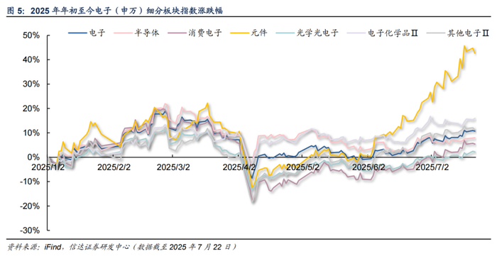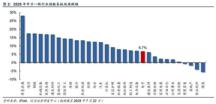 2025年初至7月22日电子指数上涨6.7%。2025年初以来,由DeepSeek掀起开源模型的热潮,重塑国产AI大模型和算力产业链的估值体系,一季度国内算力产业链表现相对强劲,且DeepSeek蒸馏模型大幅降低AI门槛,端侧AI持续演绎。进入四月以来,特朗普关税政策不断加码,中国政府坚决反制,对电子板块形成较大干扰。同时受到短期因素影响,半导体等细分板块基本面承压。Q2末随着海外AI板块回暖,国内AI产业链估值也迅速修复。2025年初至7月22日,申万电子指数上涨6.7%。