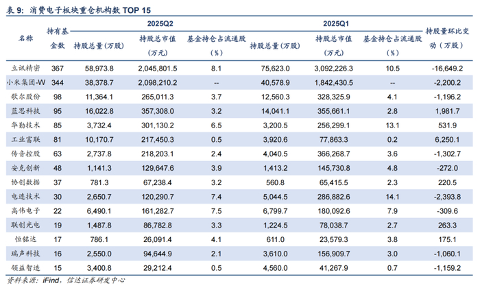 2025Q2,消费电子板块机构持仓占比3.16%,环比下降0.87pct。从机构持仓角度看,工业富联、蓝思科技、华勤技术等公司机构持仓增加较多。云侧AI方面,海外CSP和主权AI持续加强在基建的投入,产业链订单释放拉动业绩增长;端侧AI方面,AI眼镜、AI玩具等创新有望带动消费电子产品销量提升,同时增加上游零部件等环节的需求。